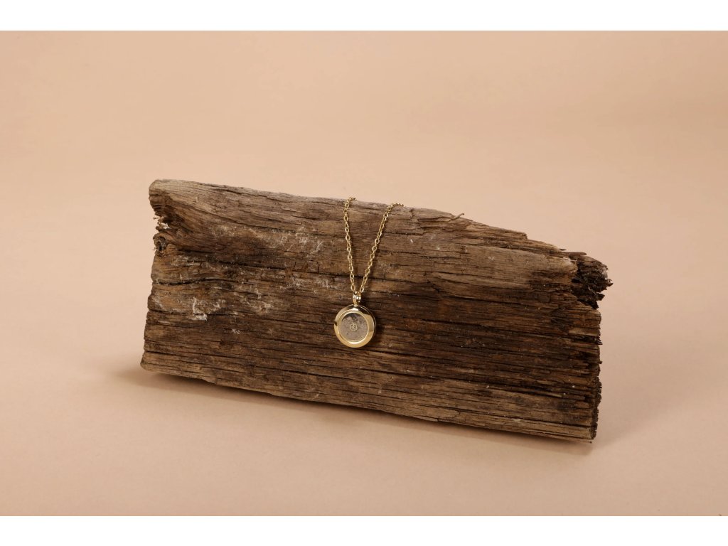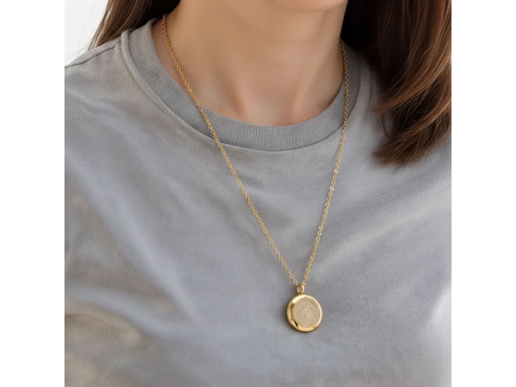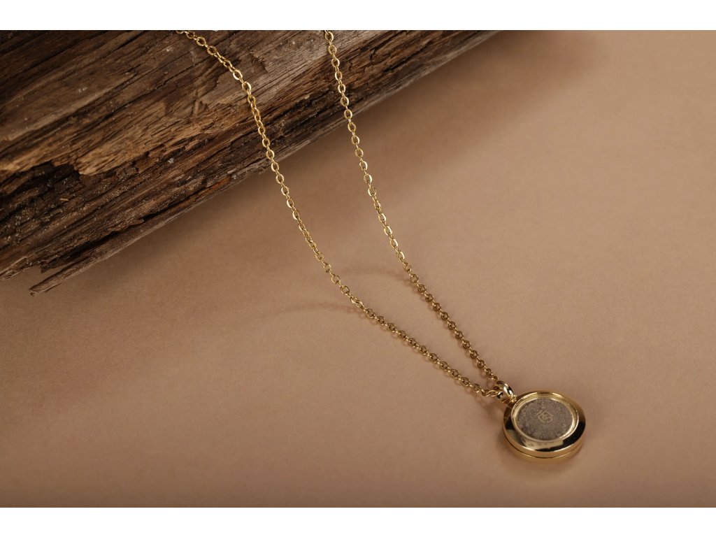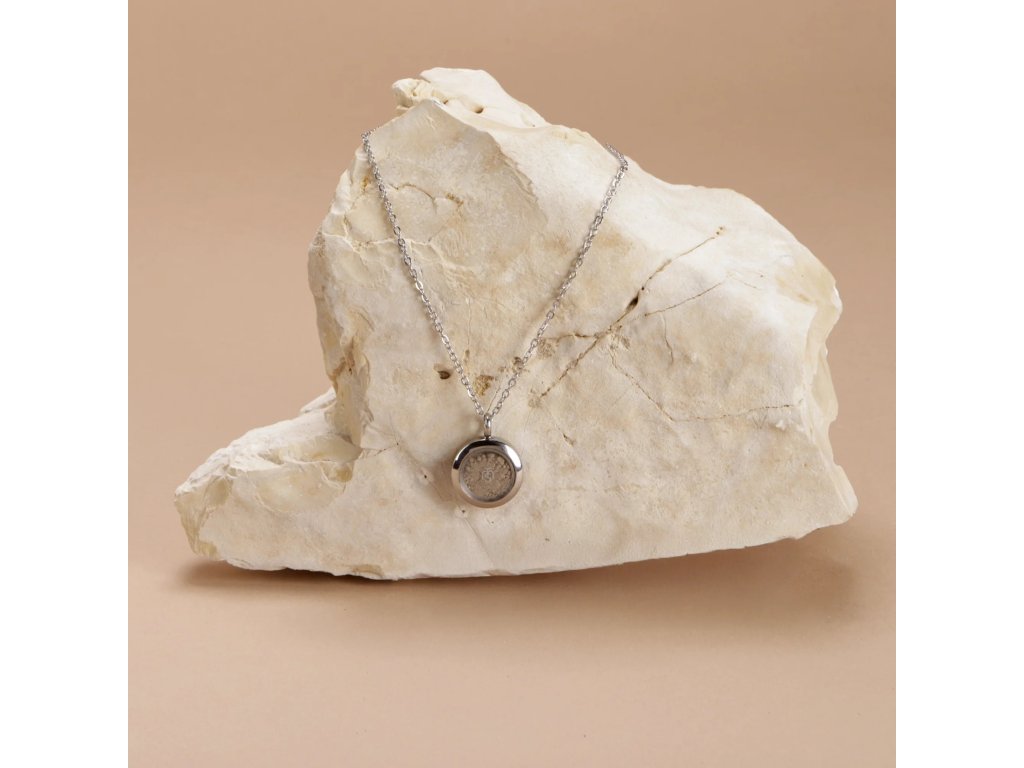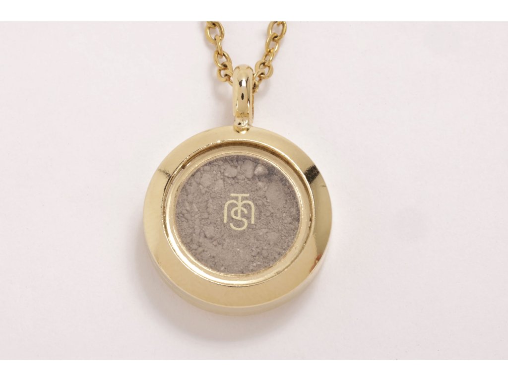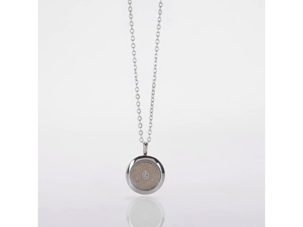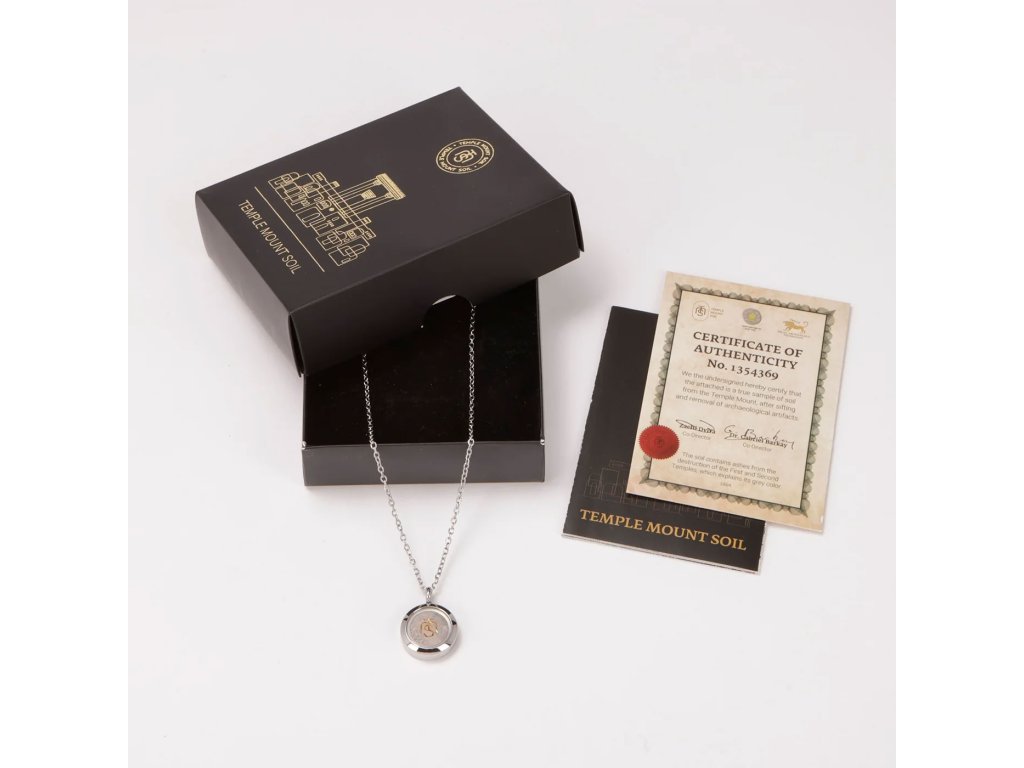 • Medailonek z nerez oceli s obsahem posvátné půdy z Chrámové hory ve stříbrné barvě.