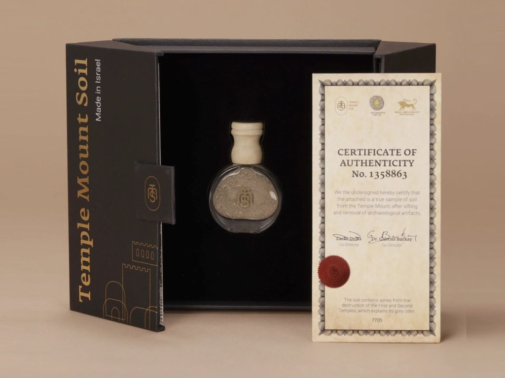 Každá láhev půdy z Chrámové hory je certifikována projektem třídění půdy z Chrámové hory, jediným autorizovaným orgánem pro ověřování její pravosti, a podepsána Dr. Gabrielem Barkayem a Zachim Dvirou, což potvrzuje její původ a význam.