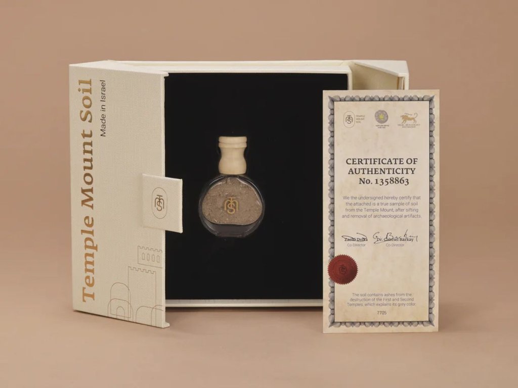 Každá láhev půdy z Chrámové hory je certifikována projektem třídění půdy z Chrámové hory, jediným autorizovaným orgánem pro ověřování její pravosti, a podepsána Dr. Gabrielem Barkayem a Zachim Dvirou, což potvrzuje její původ a význam.